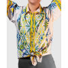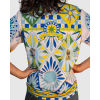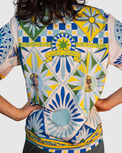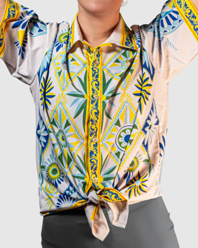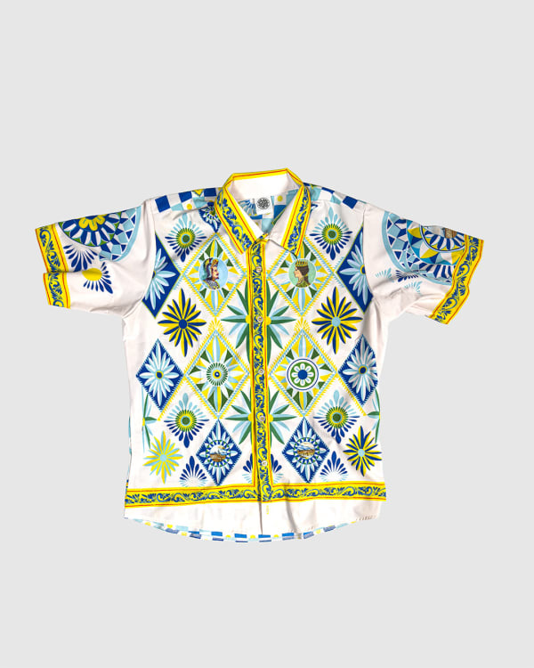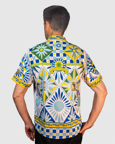 This shirt features an original hand-painted artwork inspired by the bold, geometric patterns of Southern Italian carretto design. The print is made of bright, tile-like panels filled with sunbursts, florals, and crisp geometric shapes in blues, greens, and yellows. Small portrait motifs sit inside a few of the diamond frames, adding a playful, decorative touch. The borders along the collar, placket, sleeves, and hem echo traditional ceramic patterns, giving the whole piece a vibrant, handcrafted feel.