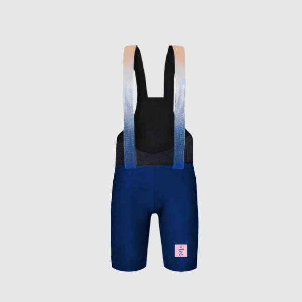 First we reduced the number of panels, seams, and stitches by engineering a single piece of fabric into an elegant bib form, our patternmaker explains the process being a bit like making a precise origami pattern out of a sheet of paper. Fewer seams yield a more comfortable fit by allowing the fabric to stretch and compress more easily; moving with your body with less restriction, especially in a cycling crouch. As a bonus, It gives the bib that super clean, sleek look. The lay-flat straps don't bind on your shoulders and they are integrated to pass through the midsection to better hold the chamois in place by keeping the pad taut and preventing the excess fabric from chafing your thighs. Impregnated raw-cut silicon grippers stay on your thighs without impinging